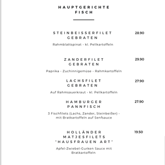 Wer Fisch liebt, findet in Gerichten wie gebratenem Zanderfilet mit Zucchinigemüse, Steinbeißerfilet mit Rahmspinat oder dem beliebten Hamburger Pannfisch eine norddeutsche Note, die perfekt zu einem Glas Weißwein passt.